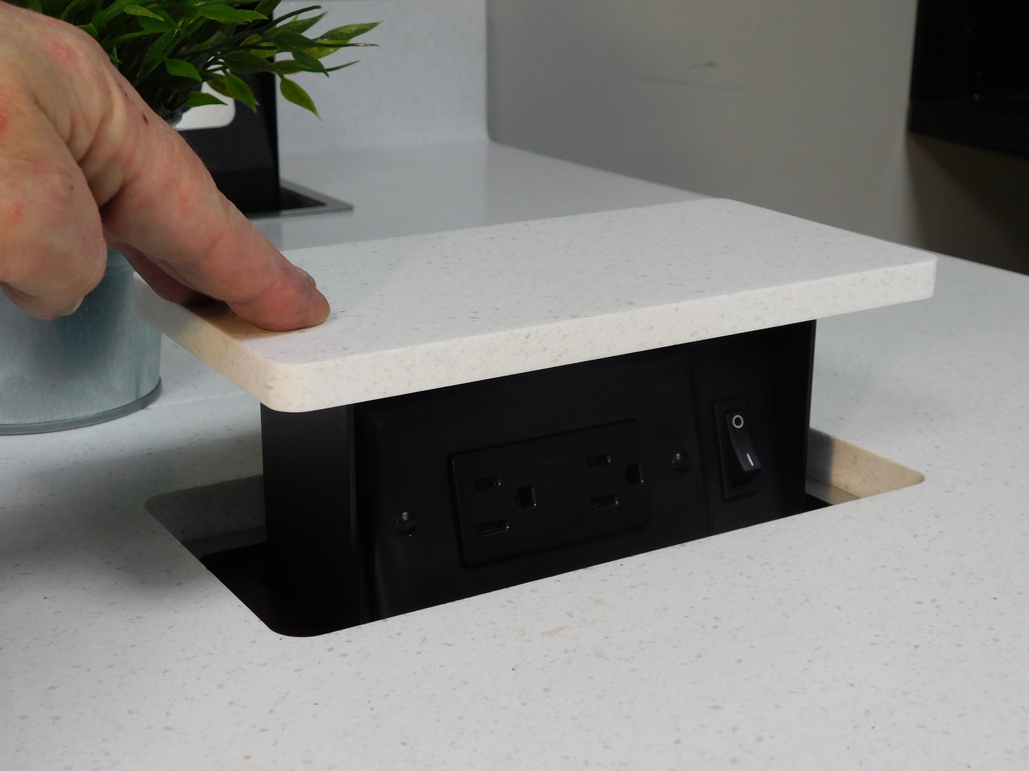 The S-Box™ is the first and only pop-up designed to accept a matching piece of your countertop material to hide the outlet (chameleon style) while maintaining the clean lines of your kitchen. Hidden in plain sight!